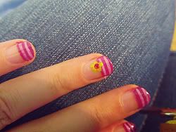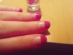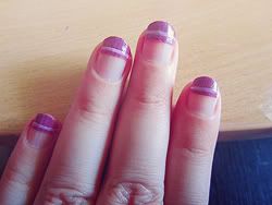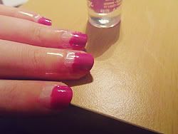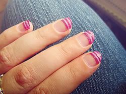 When you paint your nails with the first color, you have to wait for a while (you know, you have to wait till the nail polish dry). After that you use pink polish and do the lines on your nails. I had a few problems with that because my hands were shaking all the time. I tried to do the perfect lines, but I didn't really manage it.